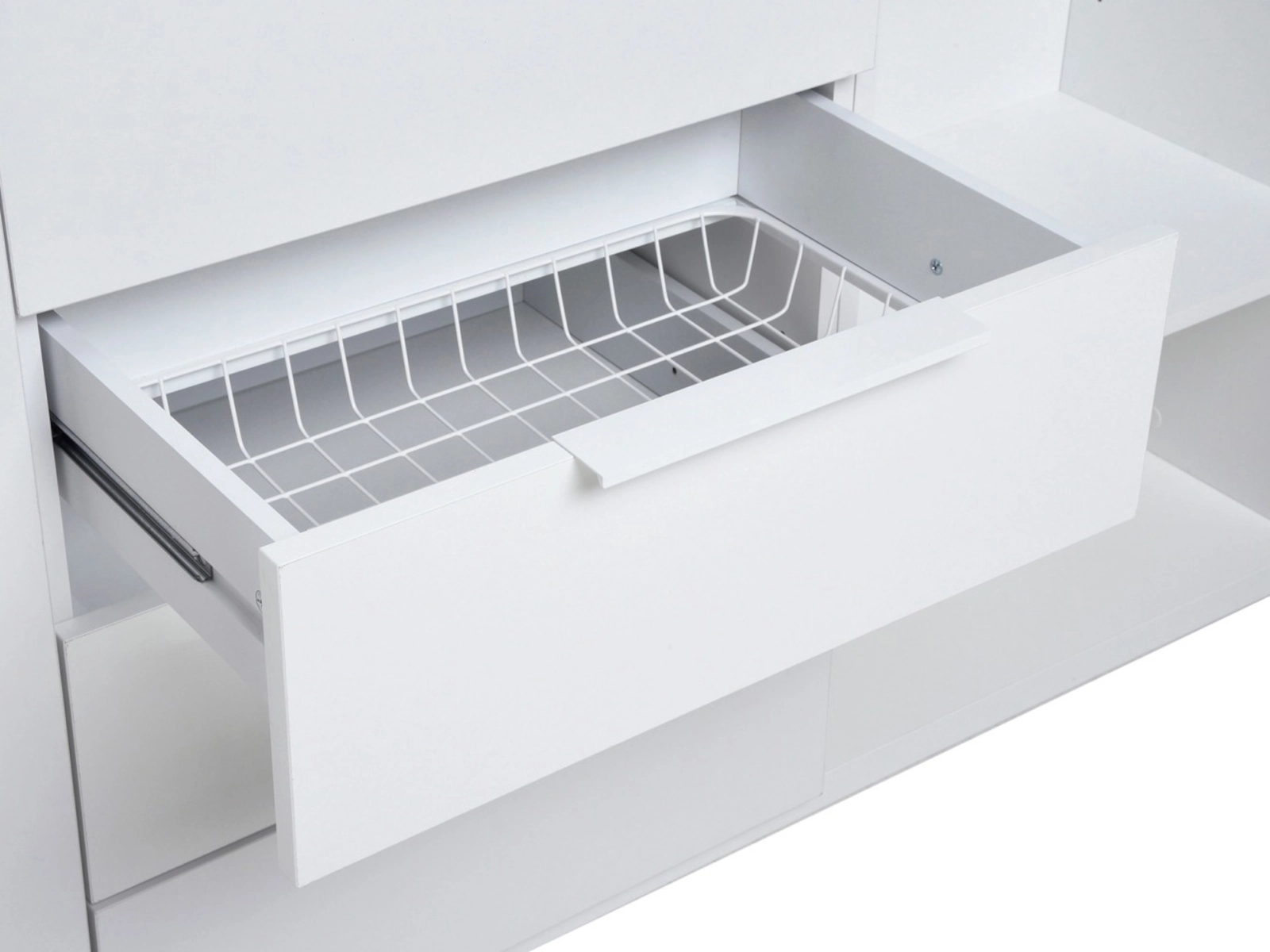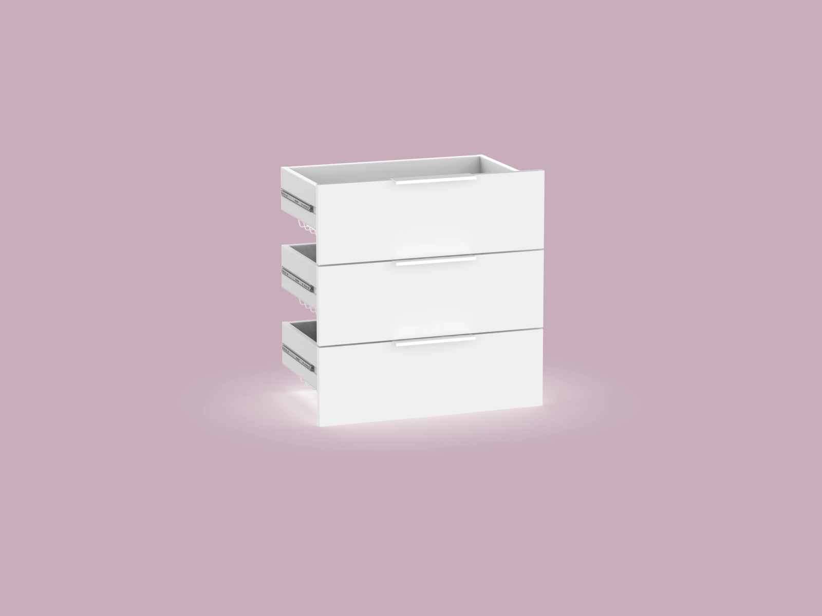 City-korilaatikoissa on tyylikkäät valkoiset metalliset profiilivetimet, jotka kiinnittyvät etulevyn taakse. Koska etulevyssä ei ole näkyviä reikiä, voit sijoittaa vetimet mihin kohtaan tahansa. Ulkonäköä voi myös muokata käyttämällä mitä tahansa vetimiä, tällä tavoin saat korilaatikkomoduulista helposti sisustukseesi sopivan ratkaisun, joka yhdistää käytännöllisyyden ja tyylikkyyden.