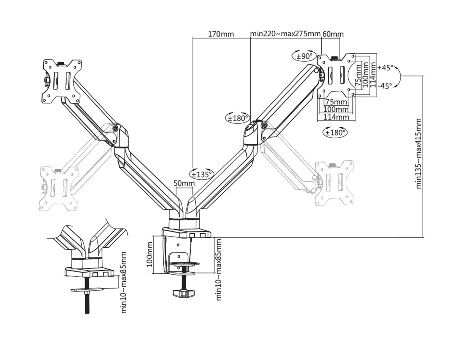 OFFICE kaksiosainen monitoriteline 2 näytölle, 17″ – 32″, VESA 75 x 75 / 100 x 100, musta