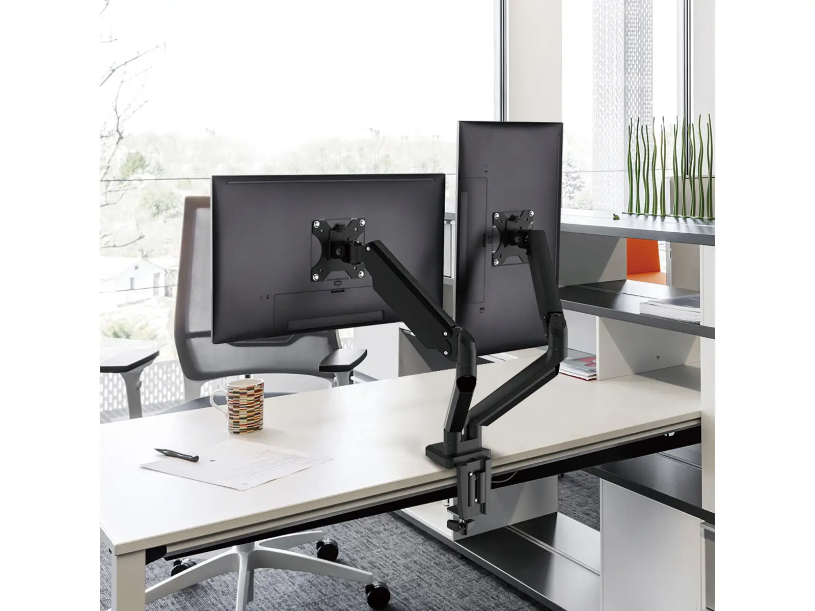 Kaksiosainen näyttöteline kahdelle näytölle, joka soveltuu erityisesti pienille työpisteille. Suurin osa isokokoisista malleista vaatii paljon tilaa, jolloin ne eivät sulaudu yhtä hyvin ympäristöönsä. Tällä tuotteella näytöt on mahdollista asettaa lyhyelle etäisyydelle seinästä.