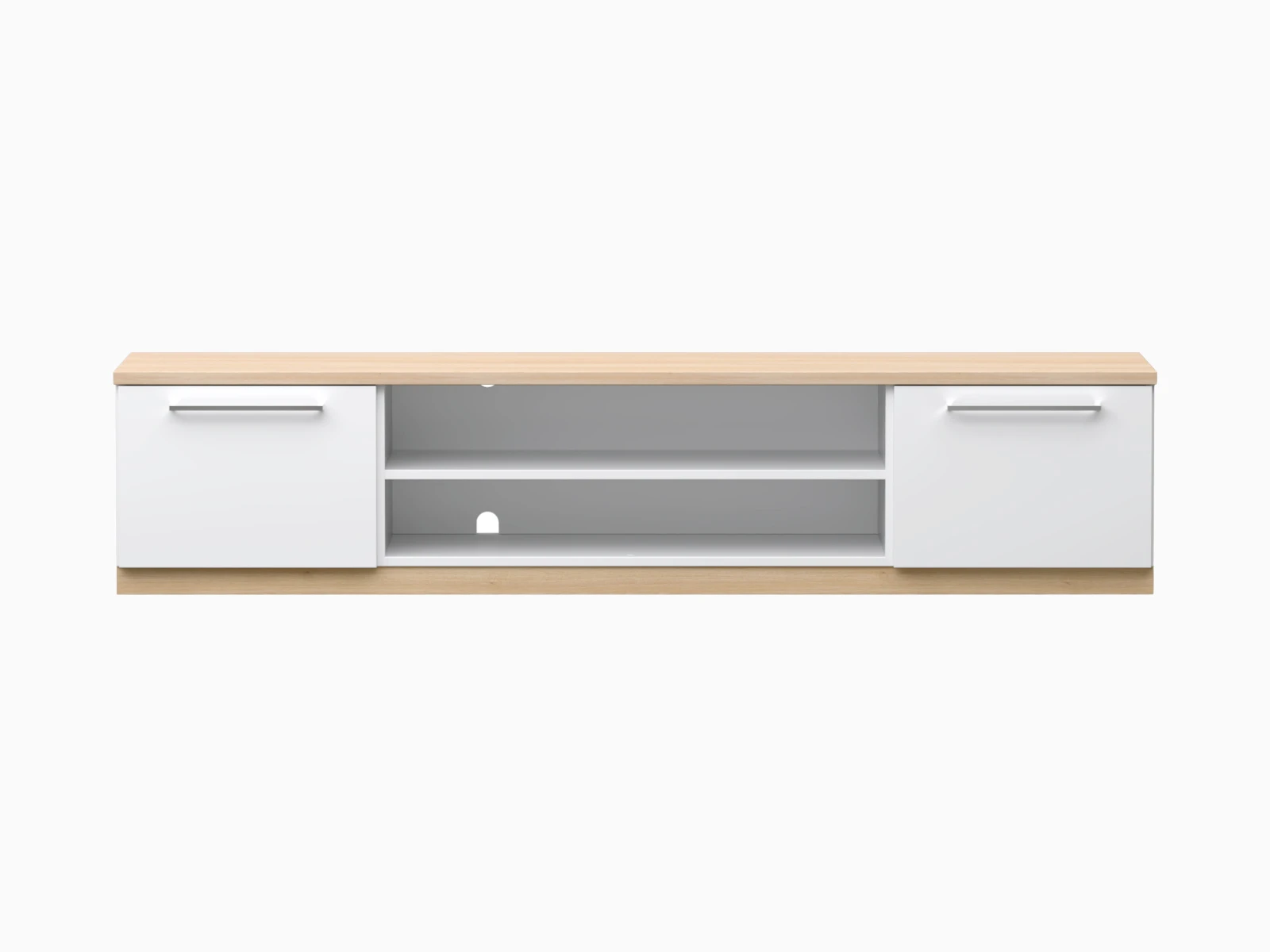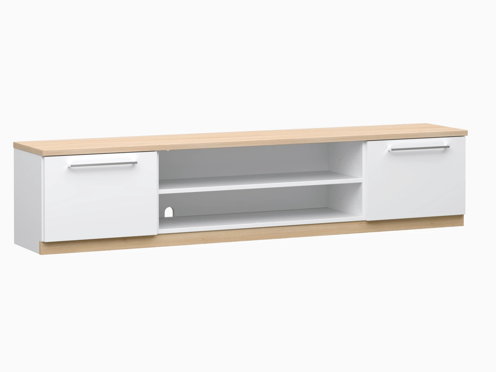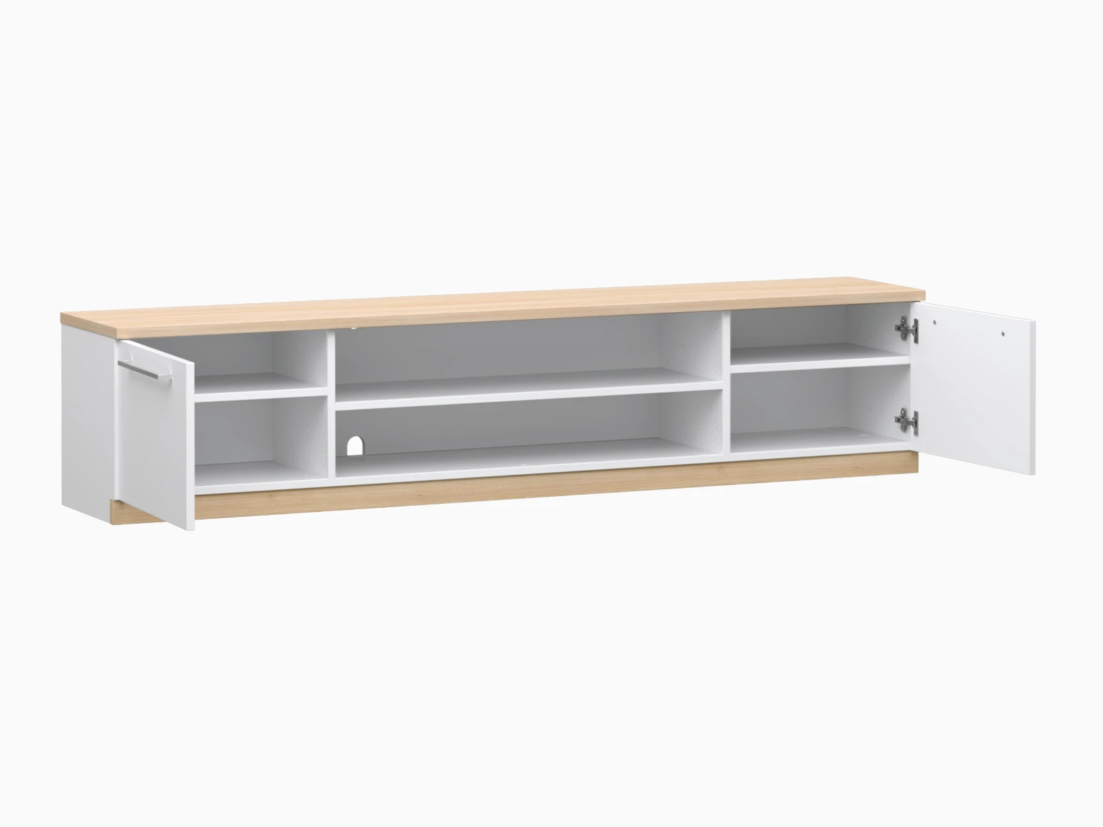 180 cm leveä tv-taso kahdella kaapilla ja tilavalla avo-osalla
