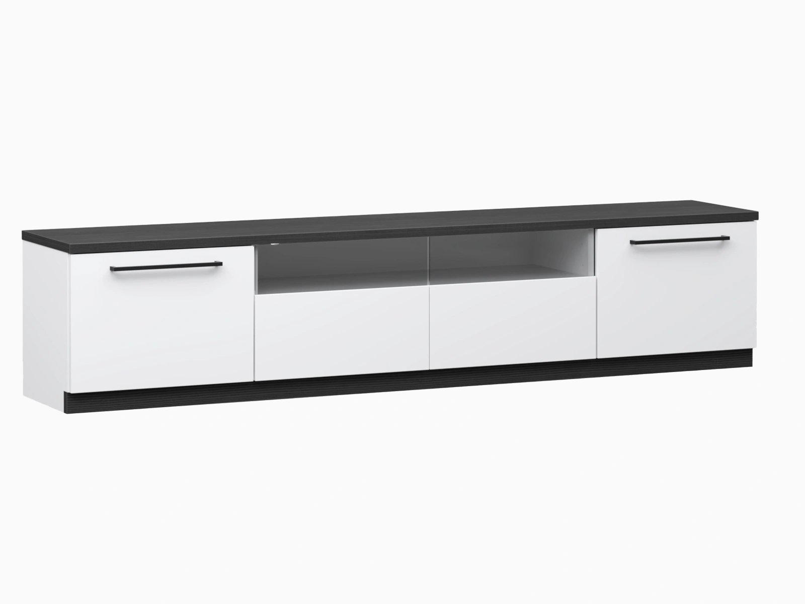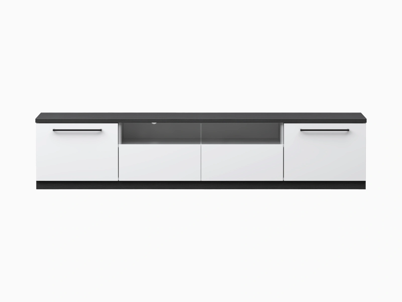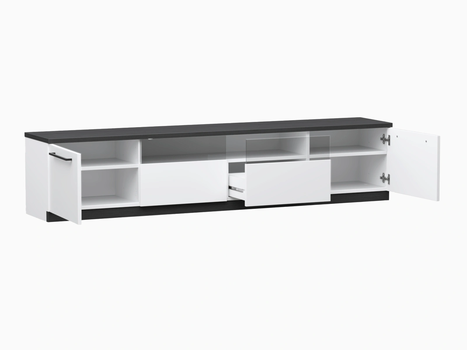 180 cm leveä tv-taso kahdella kaapilla ja lasilaatikoilla