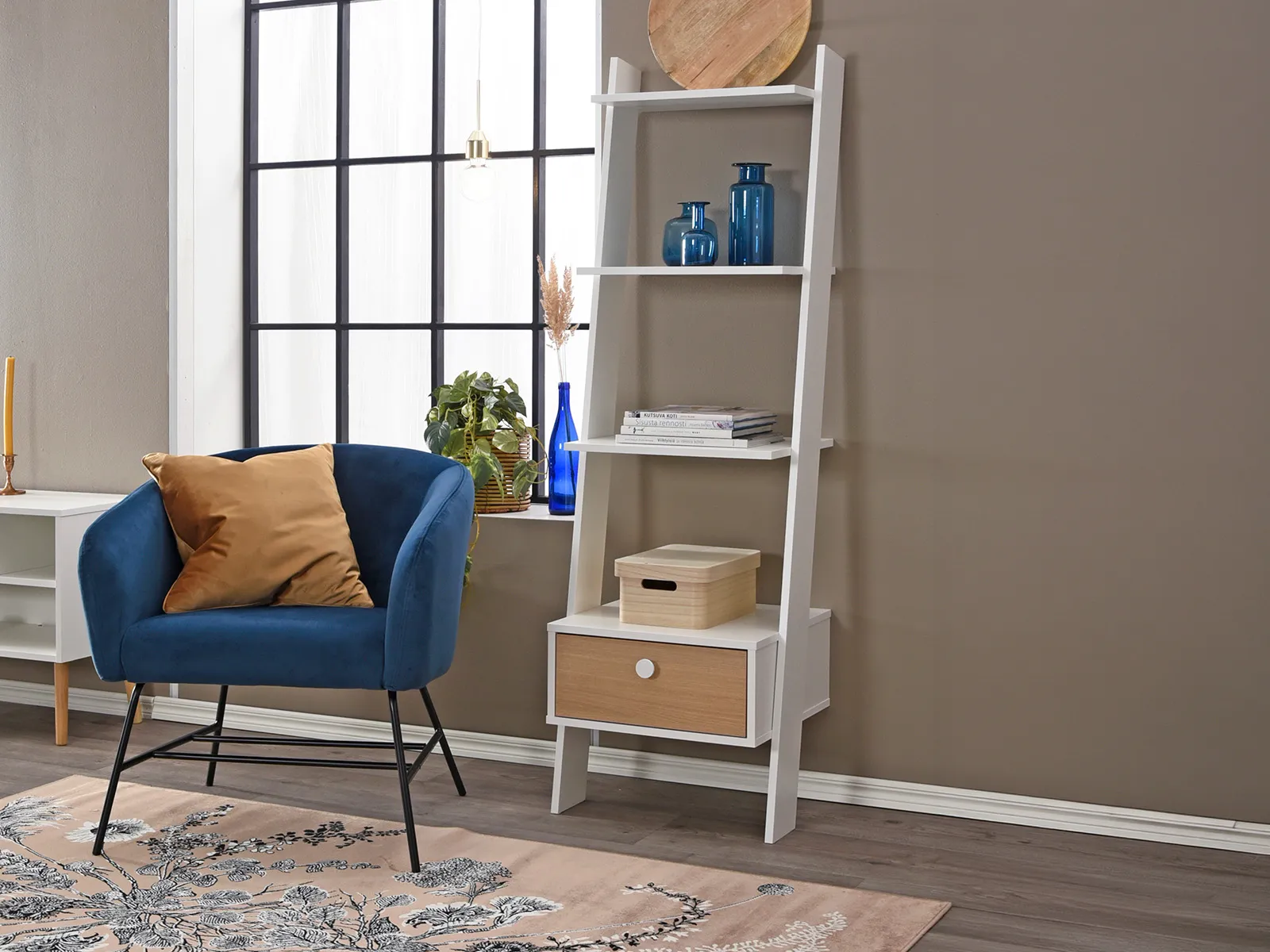 Kolme avointa tasoa sopivat kirjoille, viherkasveille ja koriste-esineille. Alaosassa sijaitseva kippikaappi tarjoaa suljettua säilytystilaa tavaroille, jotka halutaan pois näkyvistä. Kippisaranat ovat tukevat ja helppokäyttöiset, ja valkoinen metallinen nuppivedin viimeistelee kokonaisuuden.