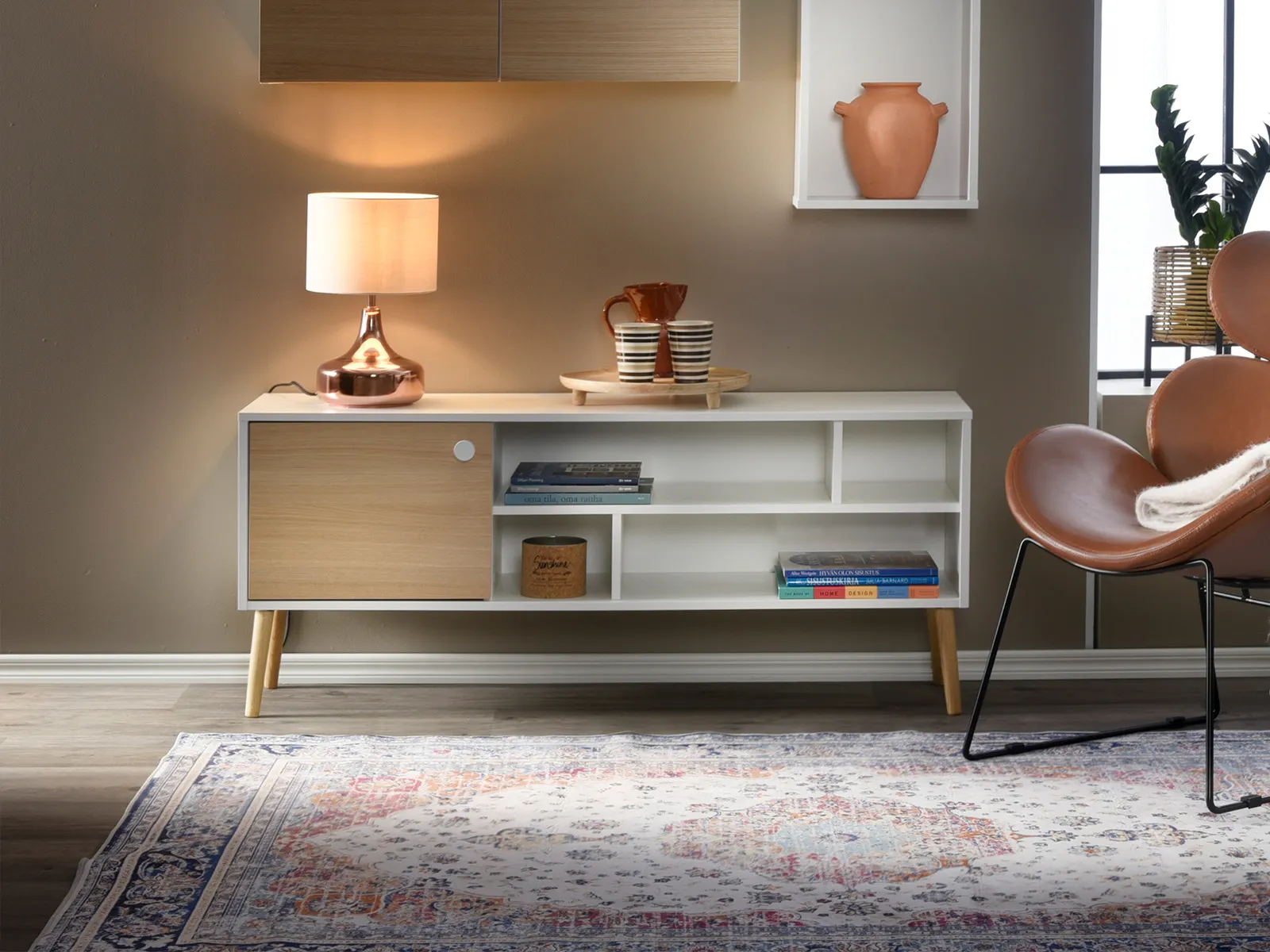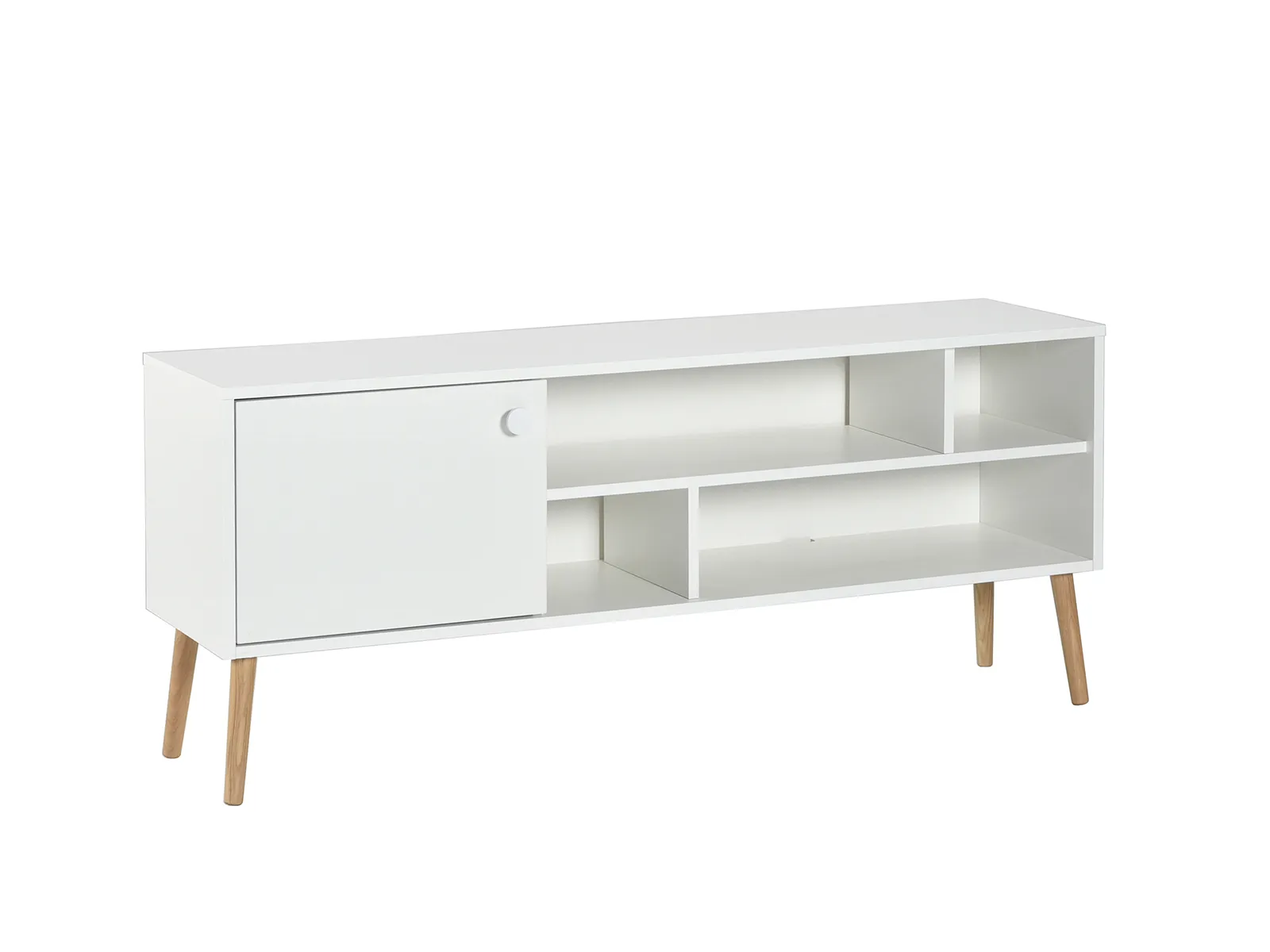 135 cm leveä kansi tarjoaa vakaan alustan televisiolle ja oheislaitteille. Avohyllyt sopivat digiboksille, pelikonsolille ja muille laitteille. Pienemmät avo-lokerot toimivat hyvin myös koriste-esineille, kirjoille tai säilytyslaatikoille.