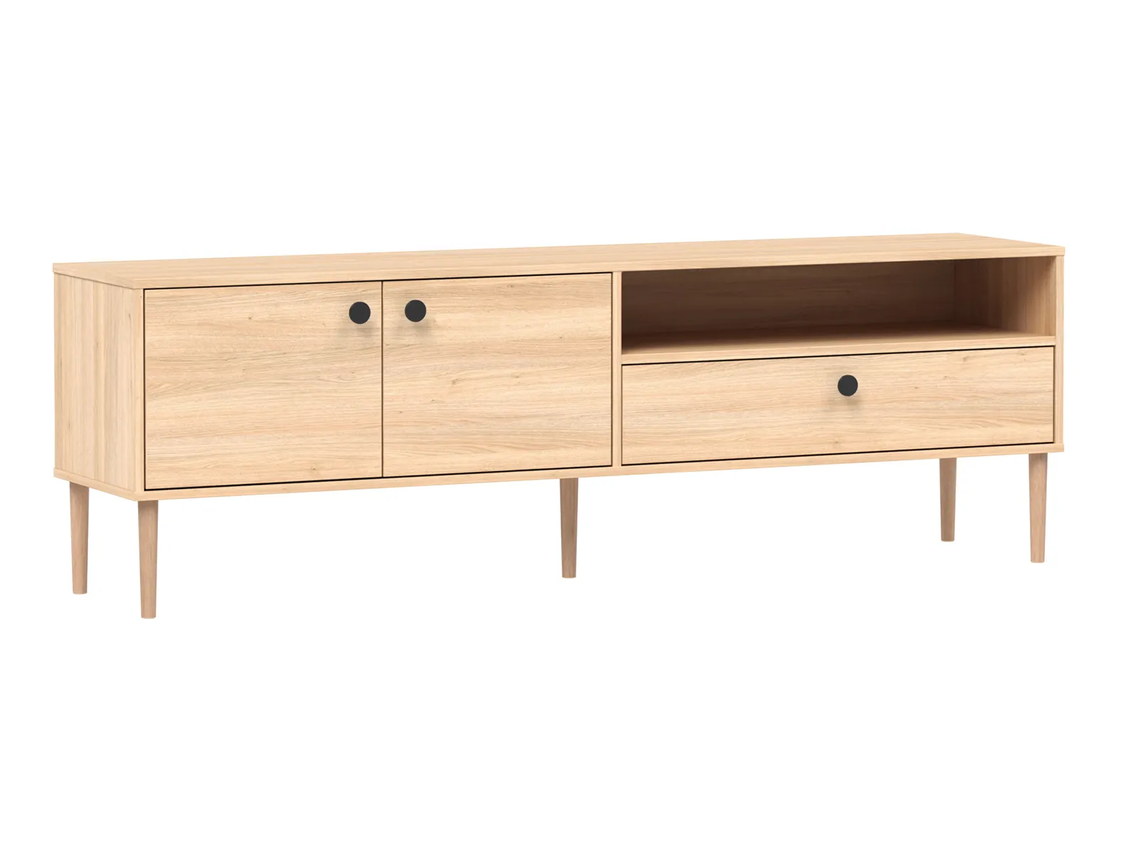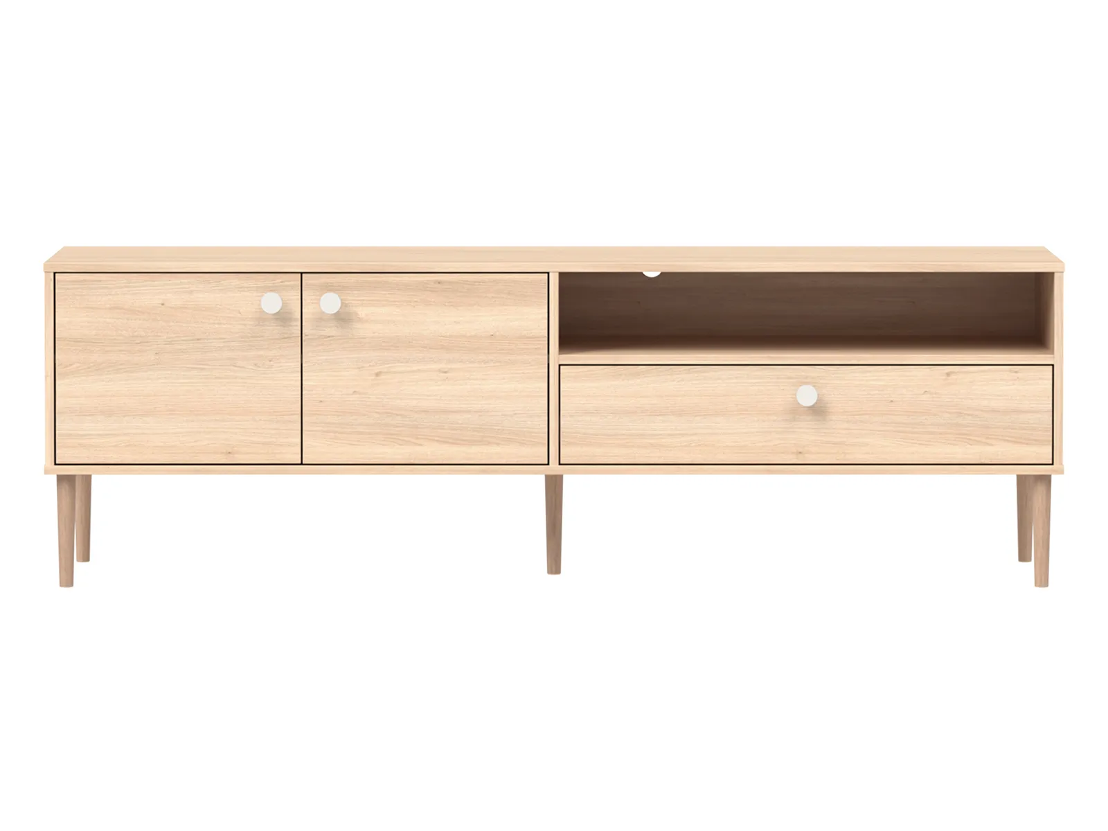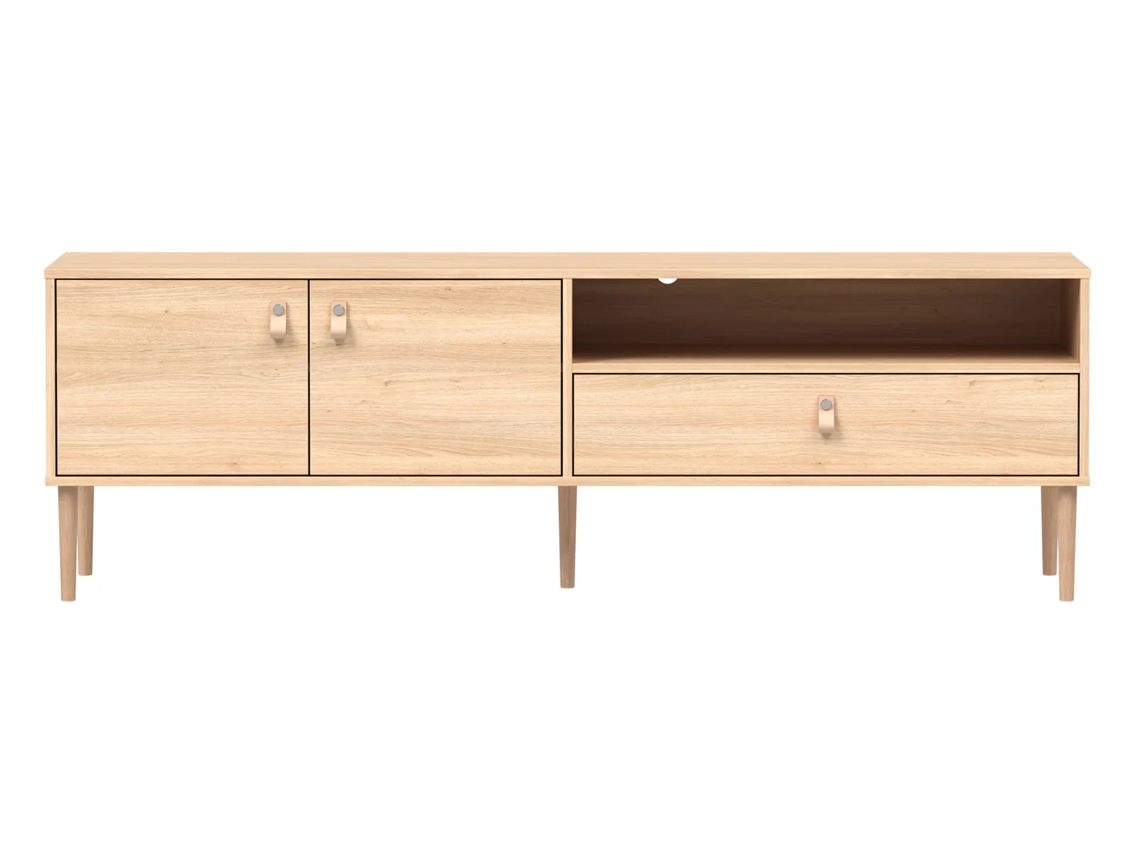 Hetki TV-taso yhdistää kaksi kaappia, tilavan laatikon ja avohyllyn selkeäksi kokonaisuudeksi tarjoten runsaasti säilytystilaa olohuoneeseen ja pitää johdot siististi piilossa.