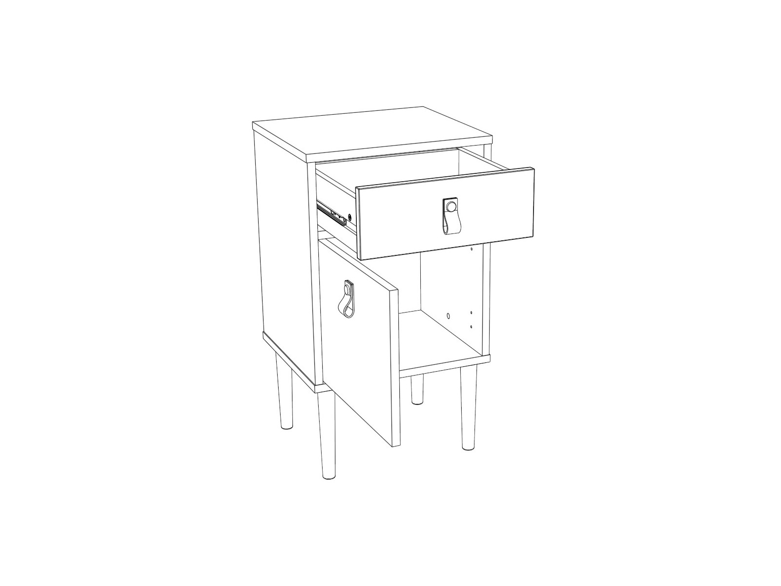 Yöpöydässä on vetolaatikko sekä kaappi, jotka tarjoavat sopivasti säilytystilaa kirjoille, latureille ja muille yöpöydällä tarvittaville tavaroille. Laatikko liikkuu kevyesti metallisilla liukukiskoilla, ja kaapin ovi on varustettu pehmeästi sulkeutuvalla soft close -saranalla.