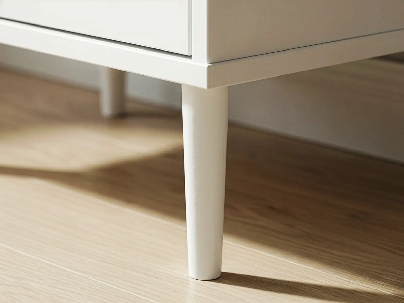 Valkoiset puujalat ja valkoiset nuppivetimet tekevät kokonaisuudesta hillityn ja perinteisen. Lopputulos on rauhallinen ja lapsiystävällinen, ja sopii monenlaiseen kotiin ilman voimakkaita kontrasteja.
